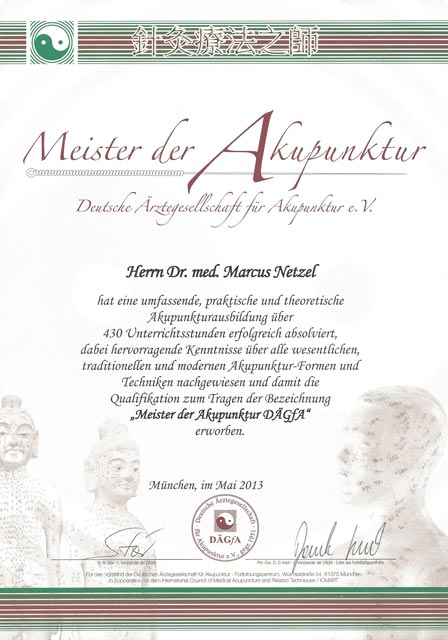 Nach wiederholten Prüfungen zum A-Diplom (FANS), Akupunkturzertifikat der Ärztekammer Schleswig Holstein, B- Diplom (DÄGfA), Zusatzbezeichnung durch die Ärztekammer Hannover, kassenärztlicher Zulassung zur Anwendung der Akupunktur in der Schmerztherapie (Kassenärztliche Vereinigung Lüneburg) und Studien in China wurde mir im Mai 2013 der „Meister der Akupunktur“ durch die DÄGFA (Deutsche Ärztegesellschaft für Akupunktur) verliehen.
