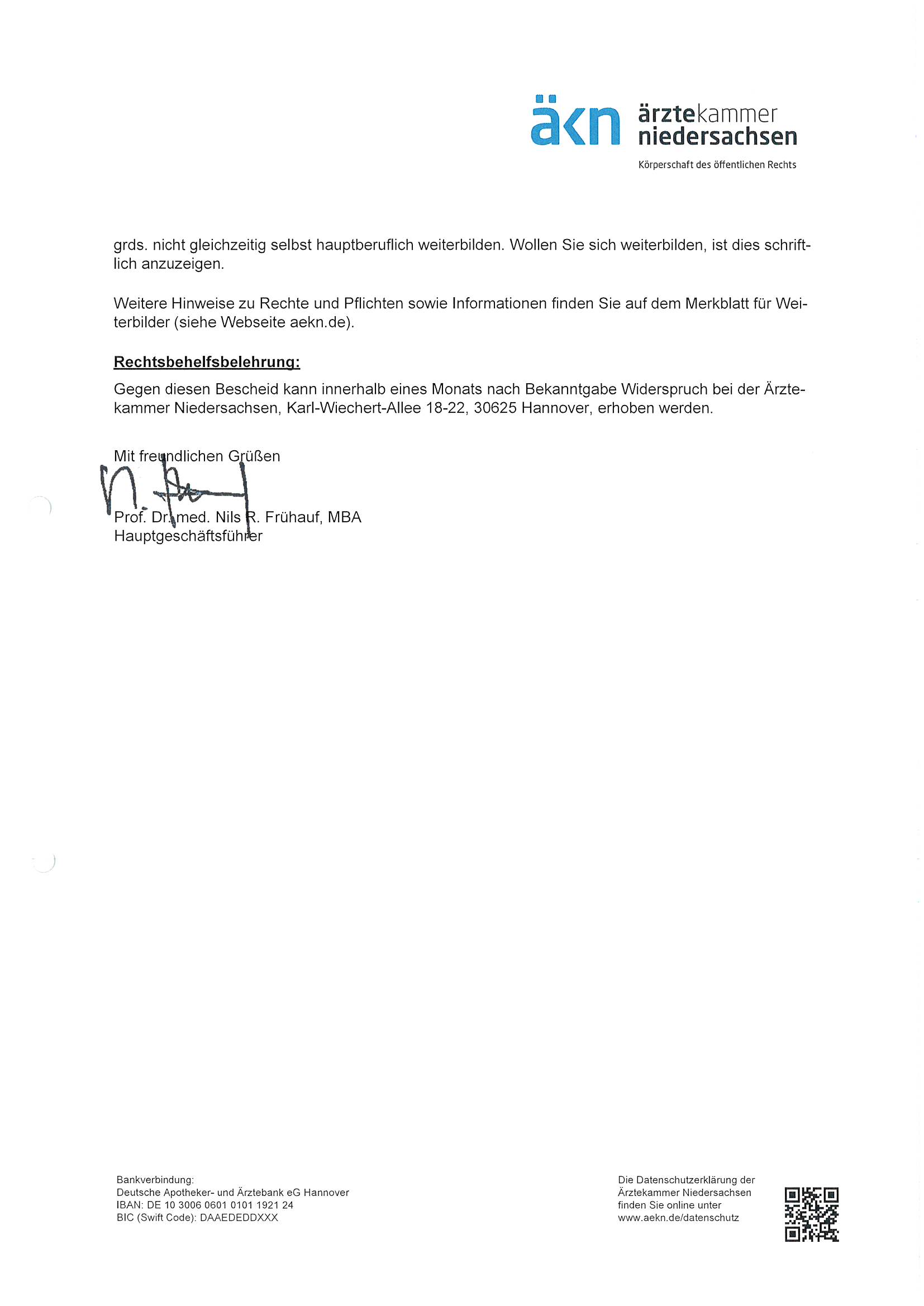 Da wir in unserer Praxis ein großes Spektrum an Leitungen in verschiedenen Fachbereichen vorhalten, wurde die Weiterbildungsermächtigung durch die Ärztekammer Niedersachsen mit Bescheid vom 17.04.23 von 24 auf 36 Monate deutlich verlängert.