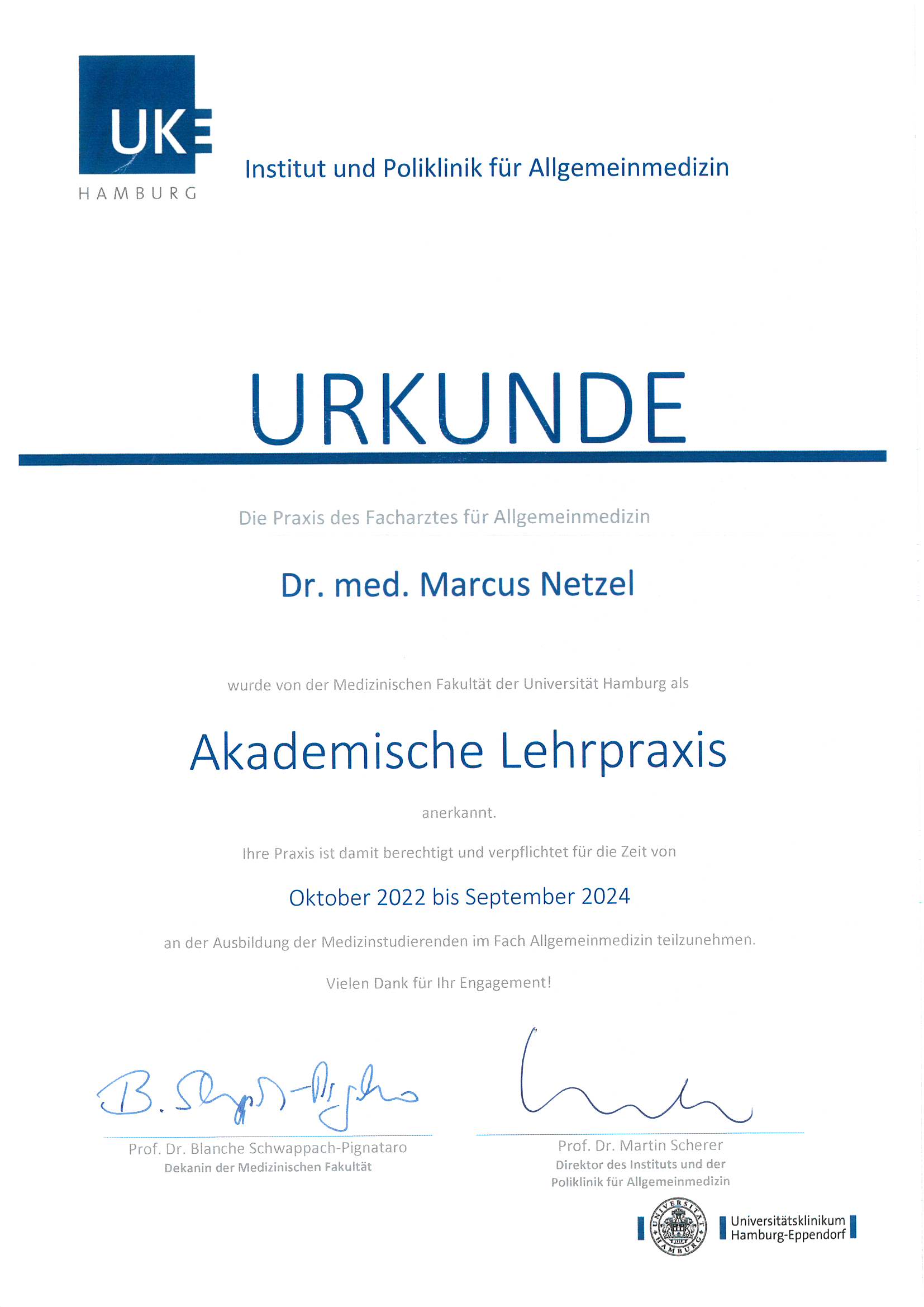 Zudem wurde unsere Praxis als Akademische Lehrpraxis für die Universitäten MHH Hannover und Eppendorf Hamburg bestätigt. Bein uns können bereits während des Studiums Praktika und Kurse absolviert werden.
